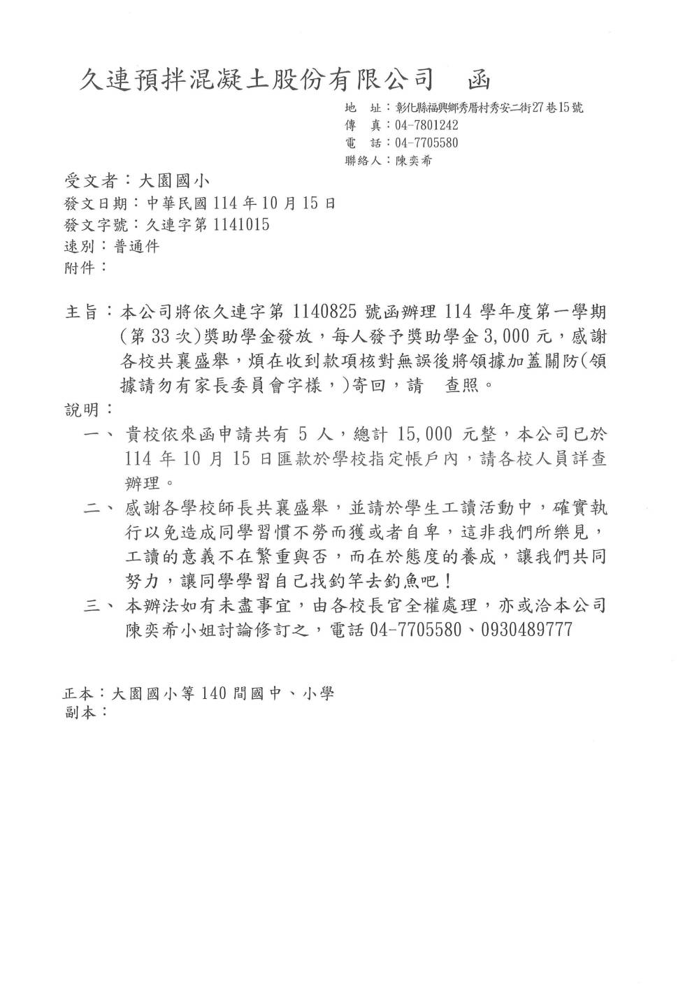 本公司舉辦第33屆(114年度第一學期)獎助學金發放已於日前完成,特此公告